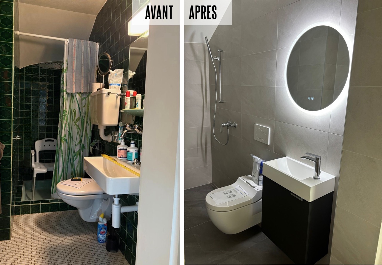 Ce prix comprend : un meuble-lavabo et un wc incluant démontage des appareils et du carrelage, évacuations des déchets, petits travaux électriques, pose du carrelage et des nouveaux appareils, peinture plafond et remise de la salle de bains finie.